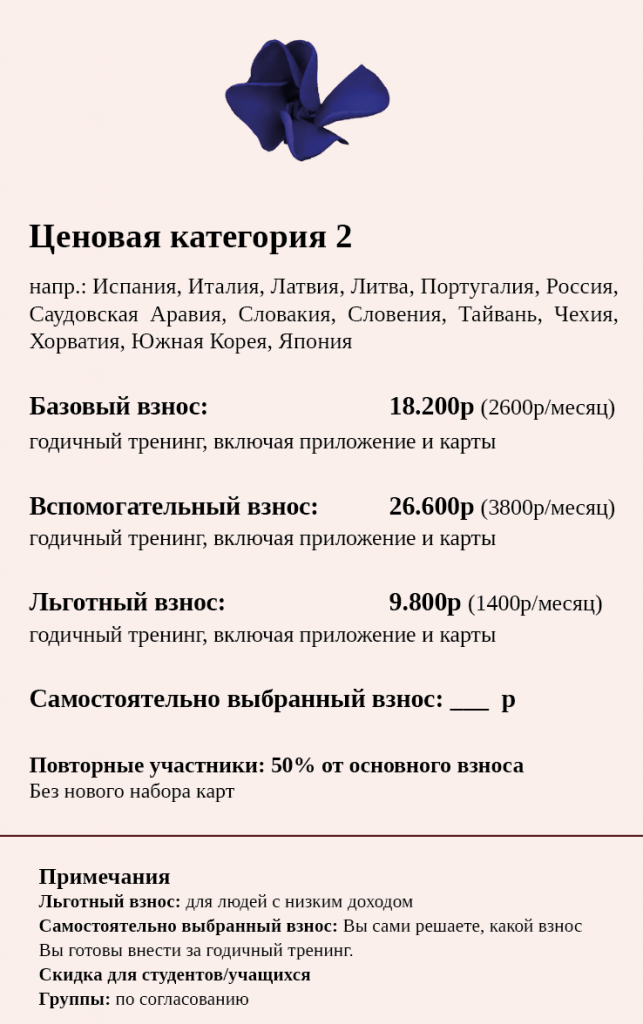 Основной взнос: средний уровень стоимости. Базовый взнос включает в себя все предложения годичного тренинга, включая приложение и мыслекарты.
